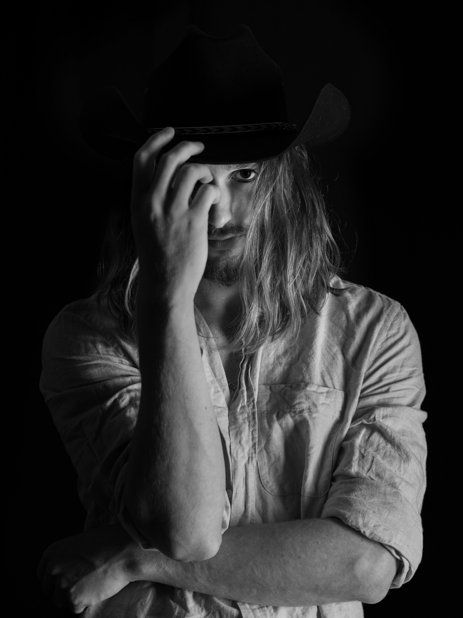 Anyway, the photo . . . . The black hat blending into the black background is dramatic, but if there were a bit of separation I think it would be better. For the sample edit I used Photoshop's 'Image>Adjustments>Shadows/Highlights' tool. That made the background lighter, but a blue tone came out so I converted the image to black and white with 'Image>Adjustments>Black and White' at the Default settings.