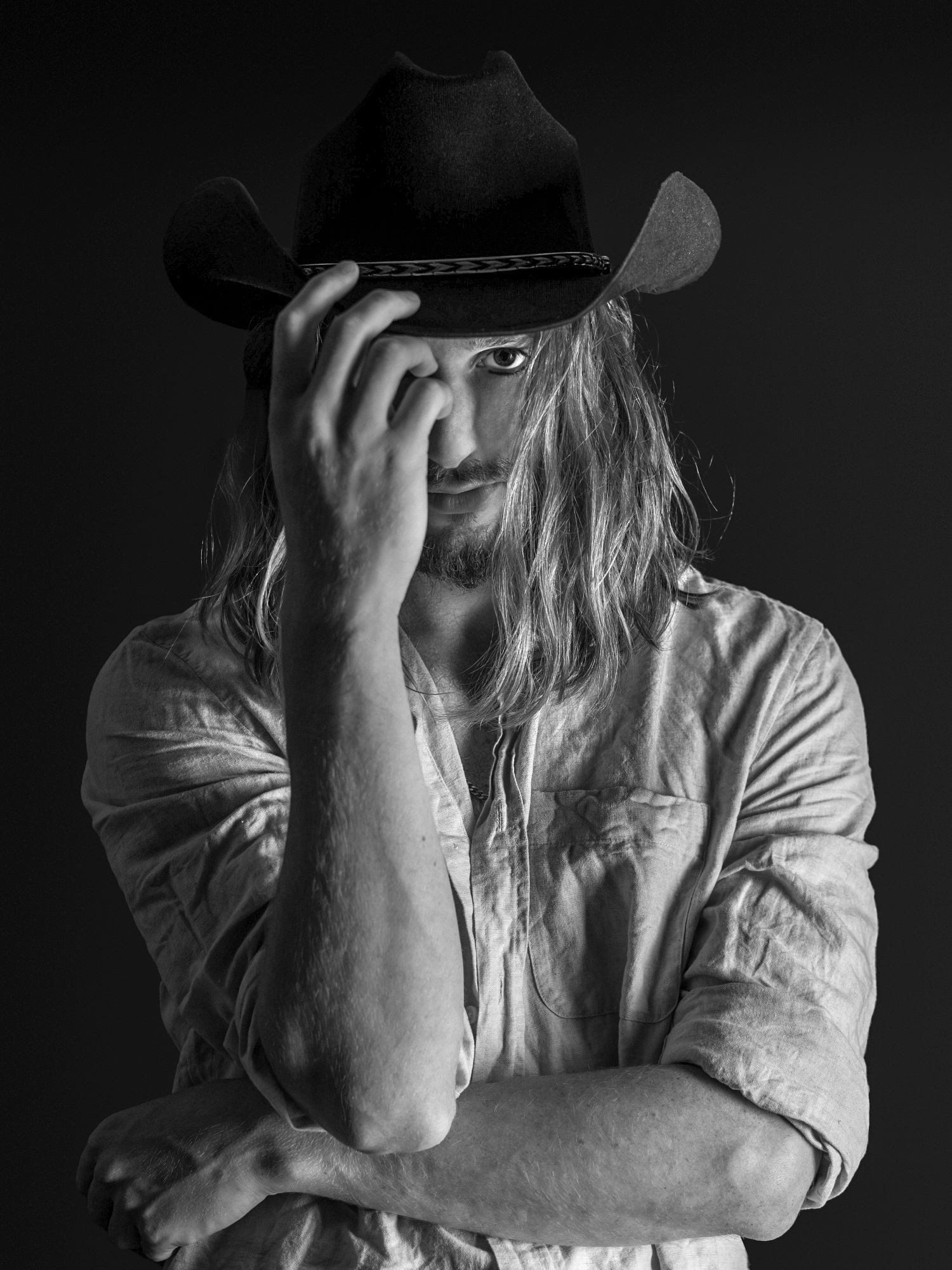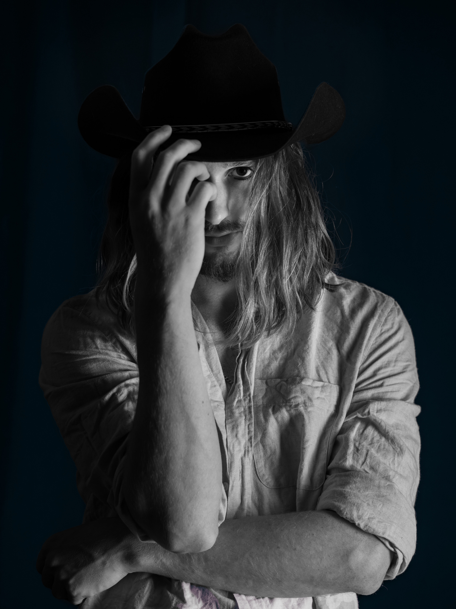 В любом случае, фотография... Чёрная шляпа, сливающаяся с чёрным фоном, выглядит драматично, но, думаю, если бы было немного разделения, было бы лучше. Для примера я использовал инструмент Photoshop «Изображение > Коррекция > Тени/Света». Это сделало фон светлее, но появился синеватый оттенок, поэтому я преобразовал изображение в чёрно-белое с помощью инструмента «Изображение > Коррекция > Чёрно-белый» с настройками по умолчанию.