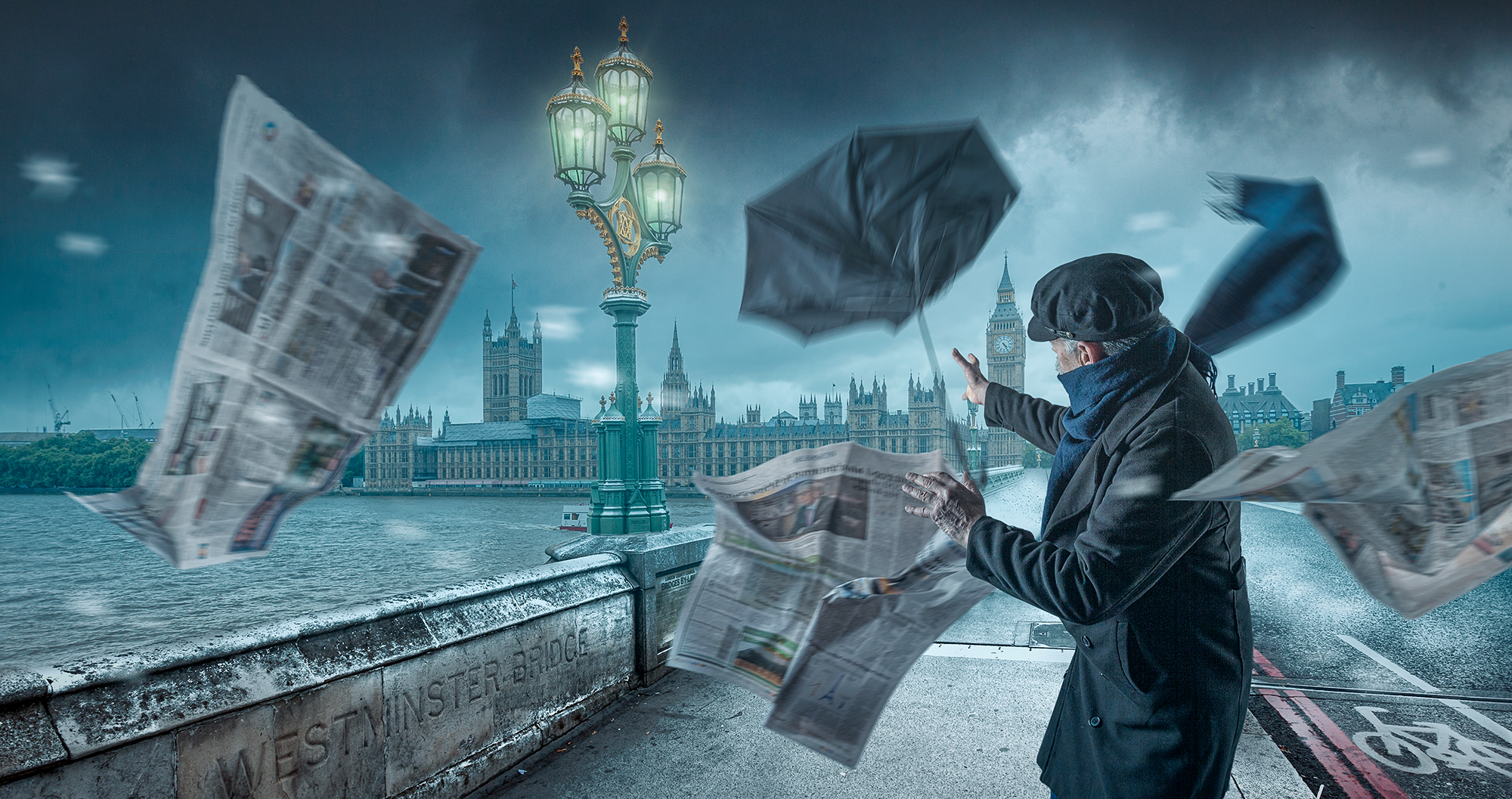 ‘Against the tide’ started as a background shot of Melbourne’s Parliament House. I deliberately chose a composition that included the pedestrian crossing because of the storytelling potential. I had no clear vision of the final image at this stage, this generally comes later as I ‘play’ with the image in post-production. When I ‘play’ with the story I will revisit past themes and try to present them in a different way. In this work, I have revisited the themes of a rainy night and multiple umbrellas; however, I always try to find a point of difference or an original idea that grabs the viewer’s eye. In this case, it is our little heroine’s newspaper ‘umbrella’.